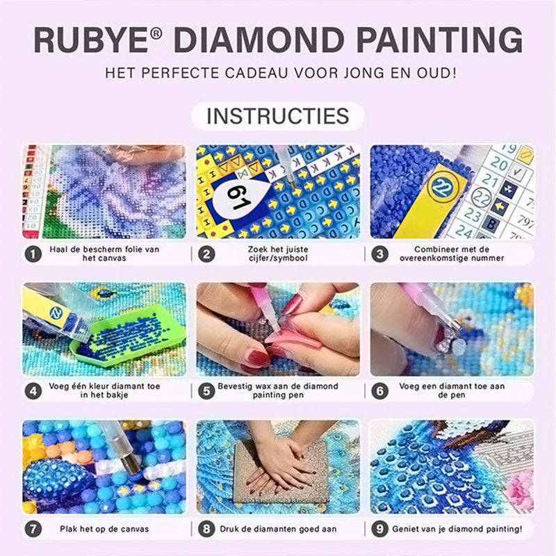Ontdek de rustgevende en creatieve wereld van Diamond Painting! Met deze 30x40CM Diamond Painting Set van Rubye creëer je schitterende kunstwerken met kleine glinsterende steentjes. Perfect om te ontspannen én een prachtig kunstwerk te maken dat je kunt ophangen of cadeau kunt geven.