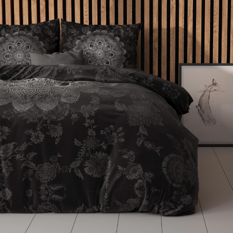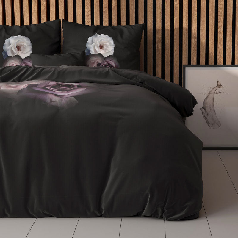 Een romantisch overtrek met bloemenprint op een diepzwarte achtergrond. Brengt warmte en elegantie in uw slaapkamer.