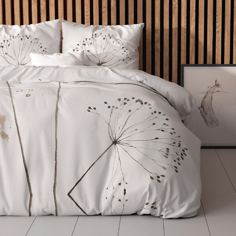 Een fris wit dekbedovertrek met zachte lenteachtige accenten. Perfect voor een lichte, serene slaapkamerstijl.